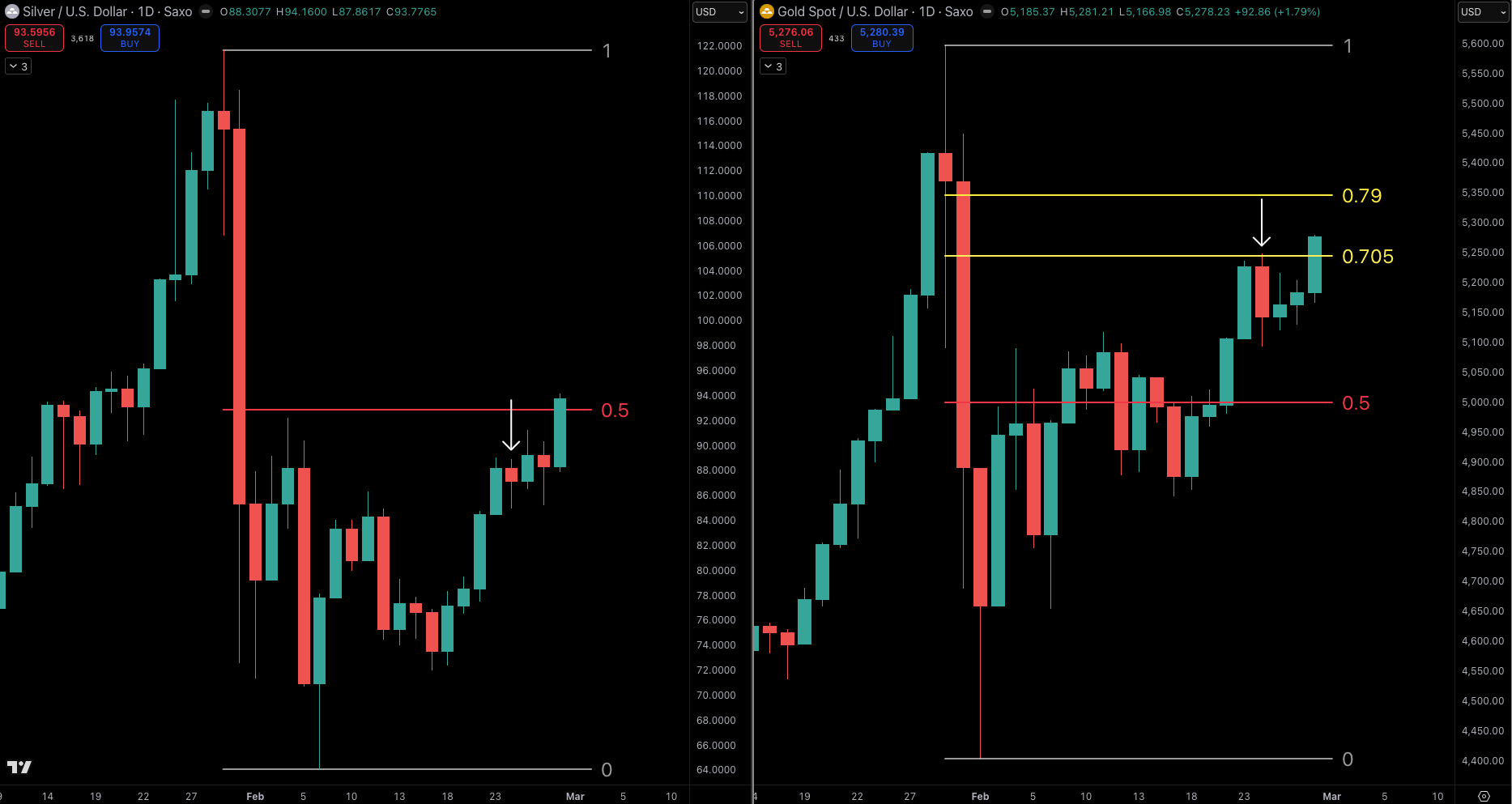 ▼シルバー(XAGUSD)のチャートで「2026年2月5日(木)〜2月27日(金)」までの部分を、「日足」でまず表示してください。